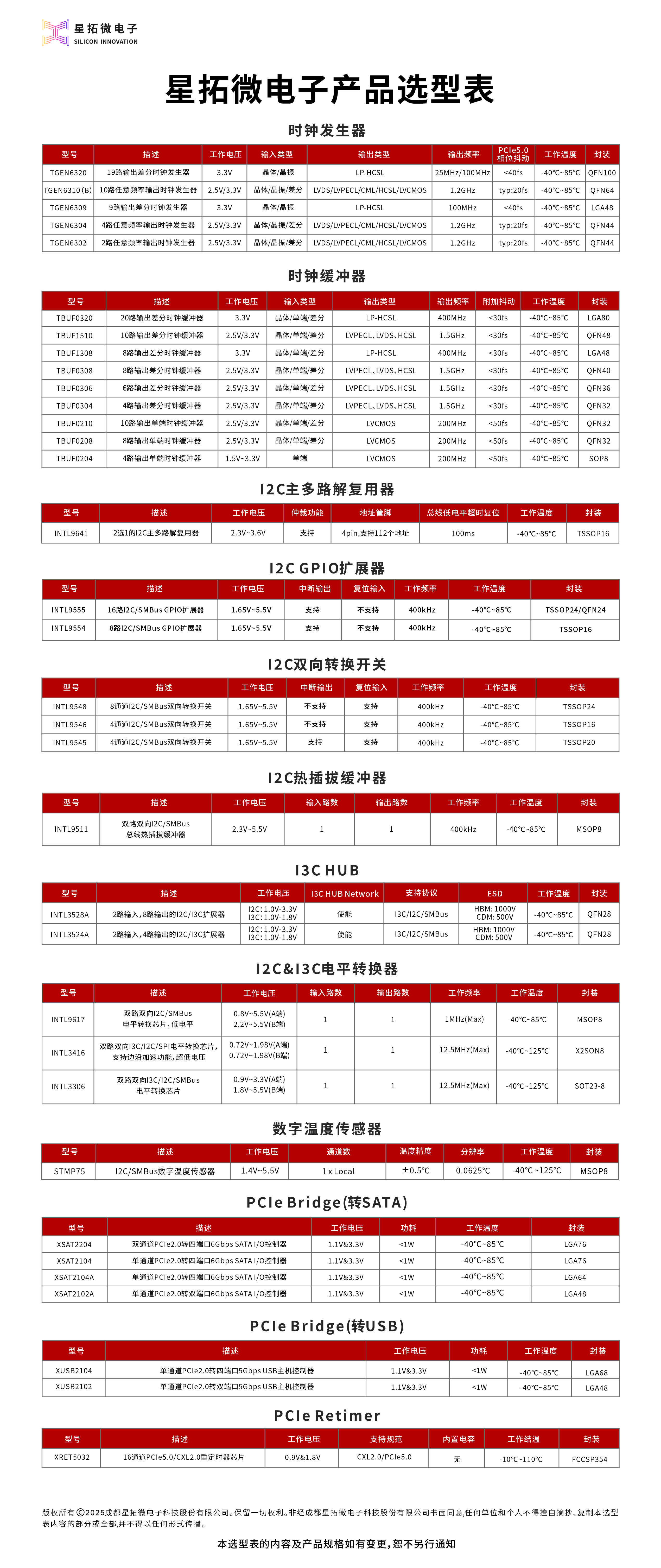 型号 工作电压 输入类型 输出类型 输出频率 PCIe Gen5 Phase Jitter 输出路数 工作温度 封装